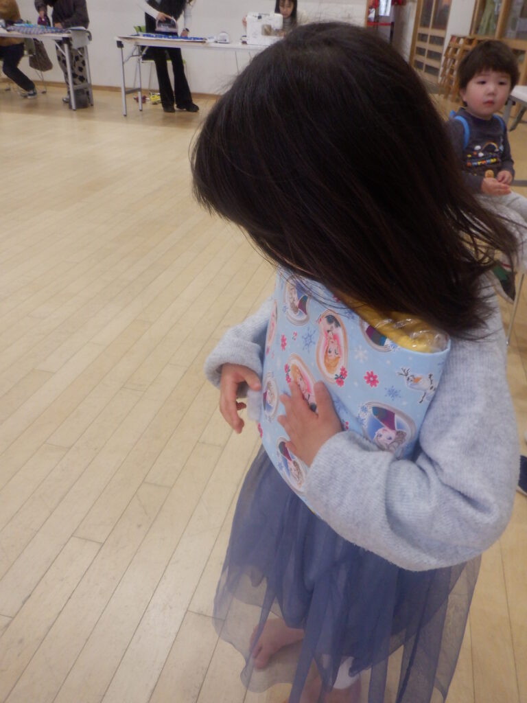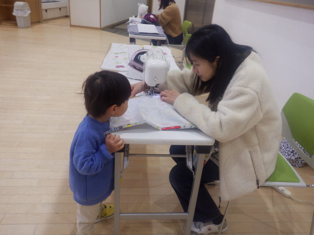 お家の方が一生懸命作ってくださる姿に、子ども達も遊ぶ手を止めてミシンの針が動く様や、布が形になっていく様子をワクワクしながらじっと見ていました。このことは子ども達の心にきっと残ることでしょうね。
